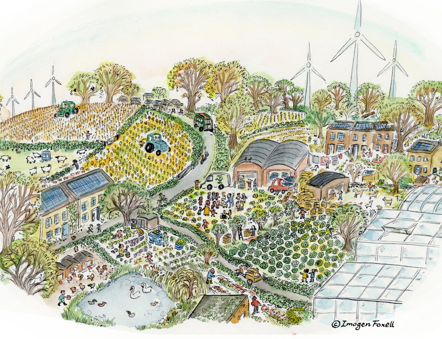 Urban areas have reduced their populations somewhat as people have moved to the surrounding countryside to produce food. That in turn has resulted in a re-invigoration of rural towns and villages, while also freeing up more urban land on which to grow more food, so that urban areas themselves are able to make a more significant contribution to providing food for their own populations. The reduced need for car parks and roads has freed up even more land for urban food production and for the creation of wild spaces that enable pollinators and other species to flourish in the city.