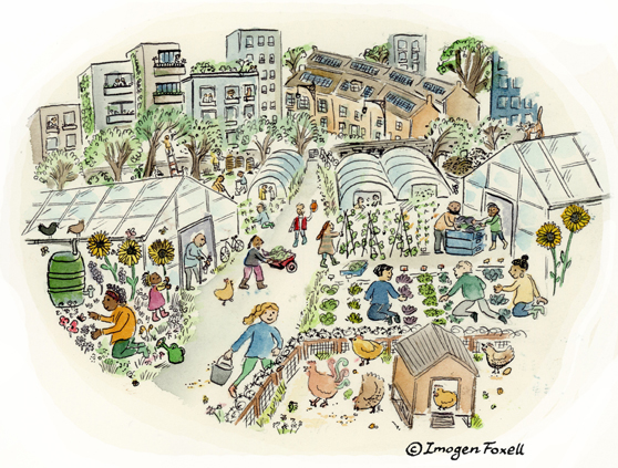 Many people are also involved in growing some of their own food at home or on allotments but more significantly they are connected to the people and the farms – be they urban or rural – that produce most of the food they eat. They regularly volunteer at their local urban market gardens, rooftop farms or underground mushroom tunnels. Those who have gardens contribute some or all of their space towards a Patchwork Farm. Everyone spends more time outdoors and has a good work/life balance.