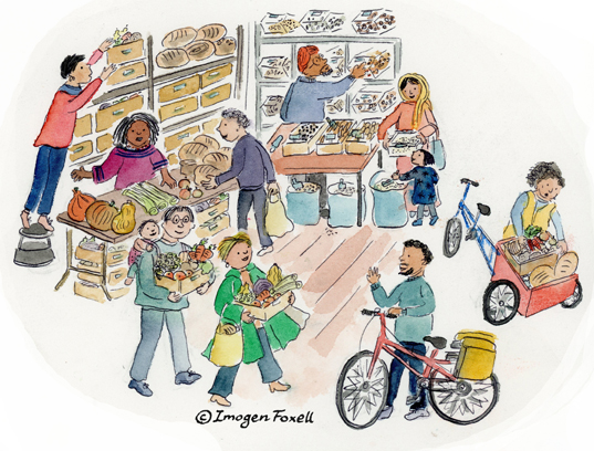 Supermarkets still exist but they control a much smaller share of the market and specialise in consumables and processed foods, leaving most of the fresh food to those traders better able to distribute that produce in a way that meets the needs of the farmers. The food they sell continues to come from the remaining larger more industrialised farms for whom this method of distribution still makes some sense, and they can provide some of the more basic products such as pasta and other non-perishables. But other systems enabling consumers to buy direct from wholefood coops, such as Suma, also abound, and there are plenty of bulk, unpackaged shops.