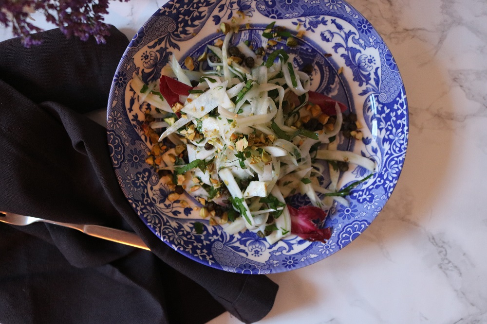 Peel and finely slice the celeriac, then slice again into ribbons. Finely slice the fennel and red onion. Mix with the rest of the ingredients, season and taste.