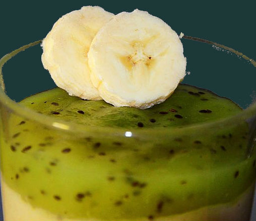 Top with the last little bit of kiwi puree and sliced banana (optional)