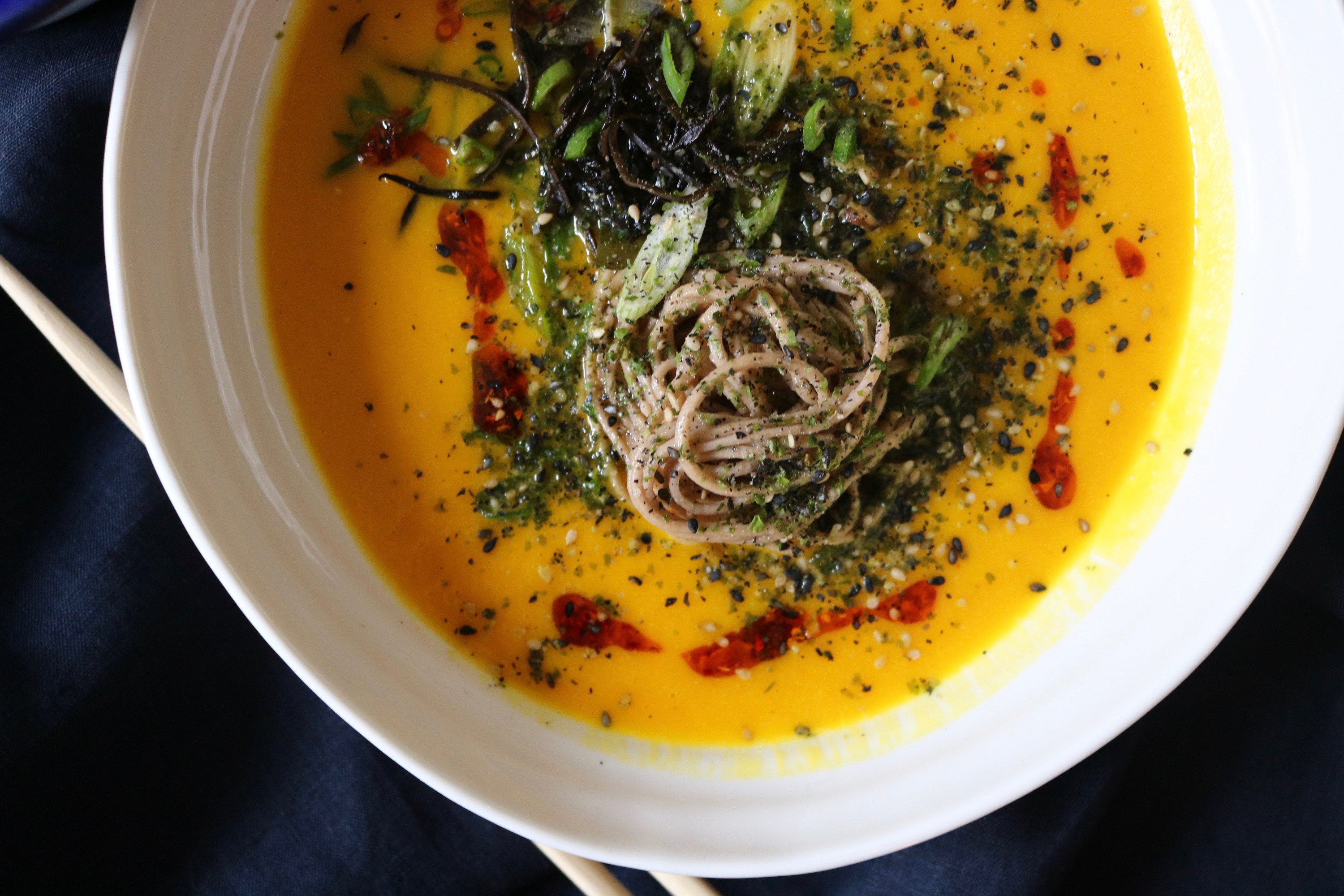 To make the broth; heat a large pan, add the coconut oil and your onion with a pinch of salt. Sweat for about 5 minutes, until they begin to soften. Add the garlic, cook for another minute, then add the squash, mix through and add the rest of your ingredients, except the miso. Cook with a lid on for about 10 minutes until your squash is soft. Remove the kombu and shiitake mushrooms, discard the kombu and slice and set aside the mushrooms to top the soup with. Blend the rest in a high speed blender with the miso. Taste for seasoning, you shouldn’t need more salt but it’s good to check.