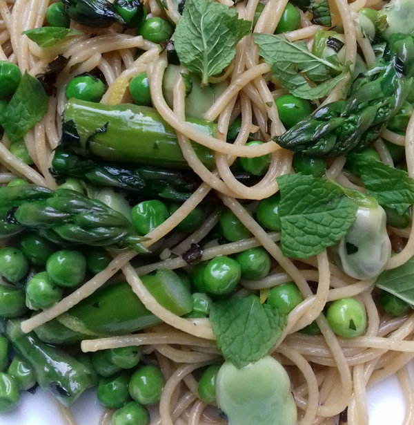 Mix the broad beans, peas and olive oil/lemon mixture with the pasta, stir well, season to taste with salt and freshly ground black pepper and scatter the mint over the top.
