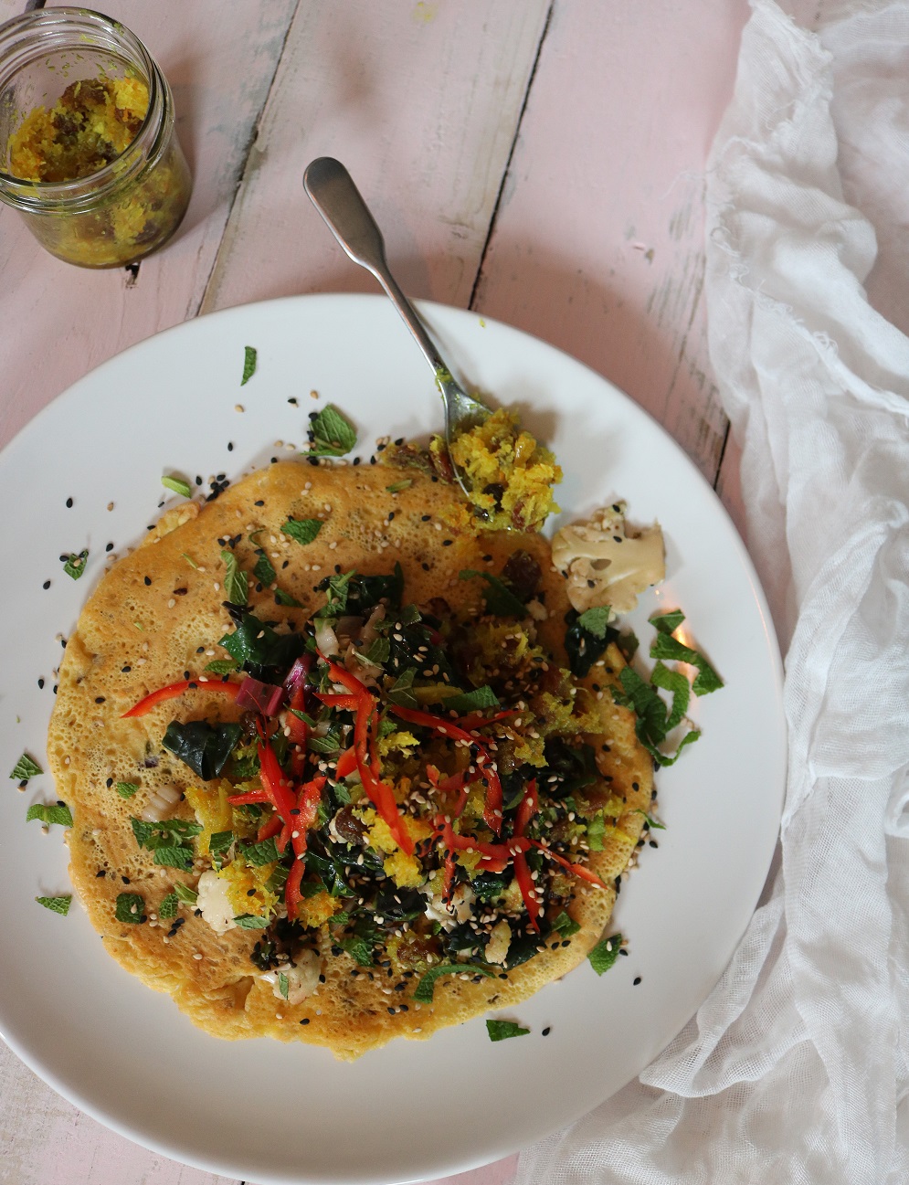 The batter needs to rest so you could make the batter in the morning or the night before for dinner or lunch the next day. Top with whatever veg you have to hand. Grilled asparagus and tomatoes would be very nice. Here I steam fried chard & cauliflower. The coconut relish is such a nice addition here, if you don’t have time to make it add a dollop of yoghurt.