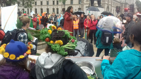 On a very wet Sunday morning a few hundred of us sustainable foodies, including a fair few Growing Communities staff, donned waterproofs, hats adorned with vegetable displays and witty banners and, accompanied by a big green tractor, marched joyfully banging pots and pans through central London, to demand better food for Britain.